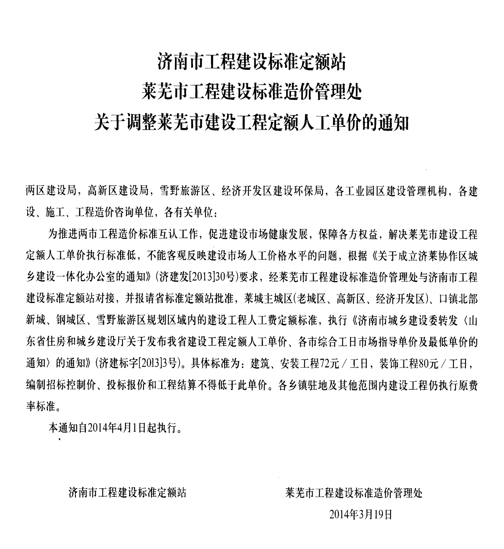 關(guān)于調(diào)整萊蕪市建設(shè)工程定額人工單價(jià)的通知